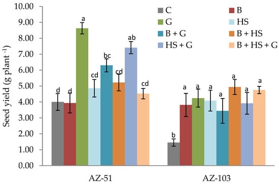 Seed yield (g plant −1) of quinoa genotypes grown in saline–sodic soil in response to chemical and organic amendments. Values are means of four replicates. Error bars represent the standard error. Significance: (AZ-51 p < 0.0001); (AZ-103 p = 0.0009). Values with the same letter are not significantly different according to Duncan’s test (p ≤ 0.05). C = control; B = biochar; G = gypsum; HS = humic substances; B + G = biochar + gypsum; B + HS = biochar + humic substances; HS + G = humic substances + gypsum; B + HS + G = biochar + humic substances + gypsum.