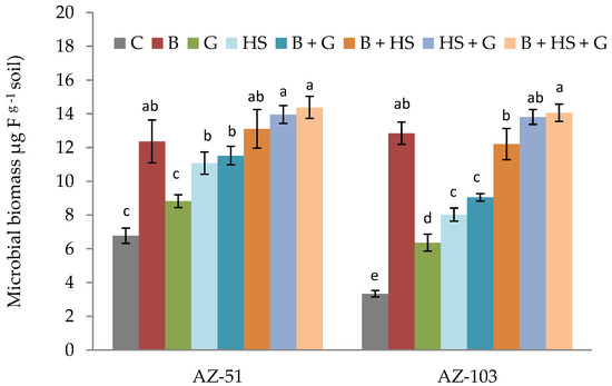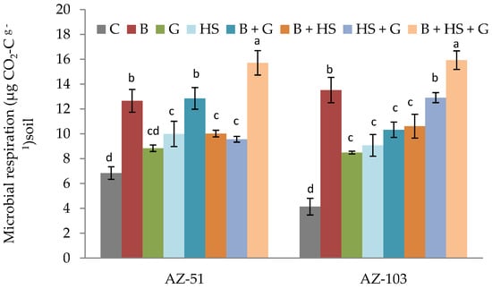 Soil microbial respiration also had significant increases in most treatments (Figure 3). In AZ-51 genotype, the highest values in soil microbial respiration were observed in B + HS + G; B + G; and B, with values 130, 88, and 85% higher, respectively, than the control. In AZ-103 genotype, all treated soils recorded significant increases with respect to untreated soils, with values 285, 227, and 211% higher than the control for B + HS + G; B; and HS + G treatments, respectively.