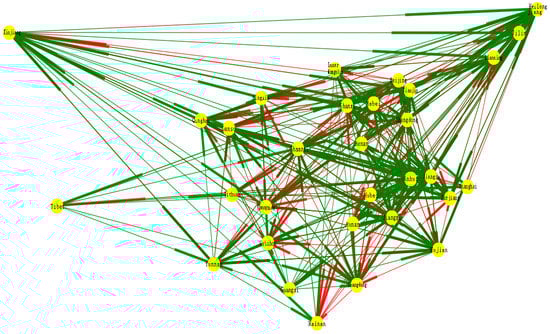 This paper is based on the data of patents granted in each province between 2000–2016 as the basic analysis data of regional innovation output to establish the SN. First, we determined the optimal lag period in the Granger causality test among the provinces, where the five standards of Hannan-quinn Criterion (HQ), Schwarz Criterion (SC), Akaike Information Criterion (AIC), Final Prediction Error (FPE), and Likelihood Ratio (LR) were used []. Second, we determined whether causality exists between two regions; if so, we drew an arrow from area A to area B in the network. Similarly, the relationship between the regions was examined in turn, and finally the SN diagram was formed. Herein, our study of regional innovation output accounts for any two-way influence between regions. Therefore, it is a directed network in which the asymmetrical accessibility between the provinces in the network is reflected by the network level. Herein, we used three methods to analyze the characteristics of the SN.