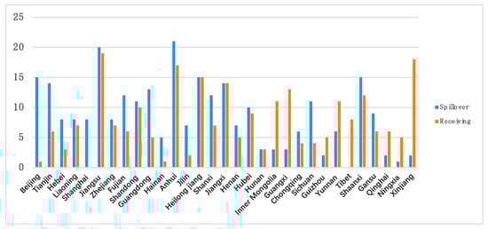 (i) Each province is closely related to the others regarding regional innovation spillover. However, there are great differences in the spatial correlations between provinces. In some areas, such as Shanghai, there are only external spillover relationships and no acceptance of relationships, whereas Tibet accepts only relationships but no spillover. The spillover relationship between the eastern and central provinces is higher than that of the western provinces, reflecting the fact that the eastern and central provinces mainly affect western provinces by spillover. Western provinces are mainly based on the relationship of acceptance, reflecting the fact that these areas are more likely to rely on absorbing innovation from other regions to spill out innovative development.