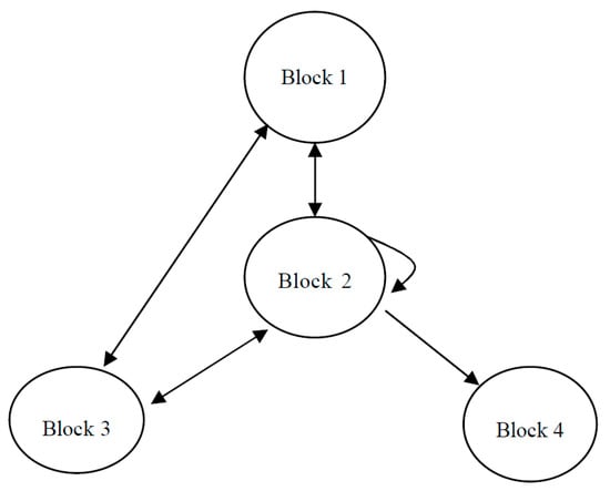 (ii) There is an obvious hierarchy between blocks. Of the four blocks, the second block occupies the central position: not only does it have an internal relationship, it also has external relationships with the other three blocks. It occupies this central position mainly because its members include both eastern developed areas (e.g., Beijing and Jiangsu) and central regions (e.g., Anhui and Jiangxi). Taking into account the spatial distance factors in regional innovation spillovers, the first block (mainly comprising eastern provinces) spills over to the eastern and central regions more, namely the second and third blocks. The second block offers the advantage of connecting eastern and western China, which is the most active in the whole block system. Although the third and fourth blocks comprise mainly western provinces, the third block (comprising most of the relatively developed western provinces) should be significantly higher than the fourth block regarding spillover. The fourth block mainly accepts the overflow of the other blocks in the whole block system. Therefore, each block has different positioning and functions.