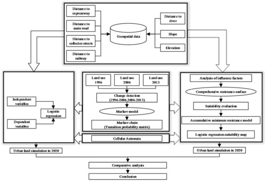 - Arsanjani, J.J.; Kainz, W.; Helbich, M.; Boloorani, A.D. Integration of logistic regression, Markov Chain and cellular automata; models to simulate urban expansion. Int. J. Appl. Earth Obs. Geoinf. 2013, 21, 265–275. [Google Scholar] [CrossRef]