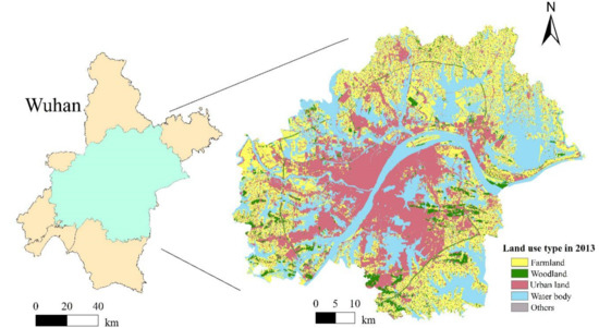 The Wuhan metropolitan area is located in the hinterlands of China and is a major city in Central China. The Yangtze River and its largest tributary, the Han Jiang River, intersect in Wuhan, which is divided into three areas. The central Wuhan metropolitan area is characterised by low and flat features with hills in the north and south. It is surrounded by hills and ridges. The entire terrain is dominated by plains. The Wuhan metropolitan area has numerous water bodies, landscapes and famous sceneries. These features constitute the local ecological environment of the area. The environment of the Wuhan metropolitan area encompasses the Yangtze River, East Lake, National Wetland Park of Dragon Island and woodlands. The local government designated a 1814 km2 urban ecological ‘red-line district’ wherein construction is prohibited. The area of forest land in Wuhan is 20,568.84 ha in 2013. This tract accounts for 5% of the total area of the Wuhan metropolitan area and should be protected during urban development. We take the Wuhan metropolitan area as a representative area and use the MCR-modified CA–Markov model to simulate the future expansion of this area. We further verify the reliability of our proposed method.