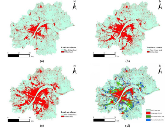 1996, 2006, and 2013 land-use maps of the Wuhan metropolitan area. (a) land use 1996; (b) land use 2006; (c) land use 2013; and (d) spatial distribution of land use.