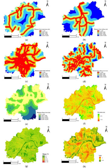 Mapping of influential factors. (a) Distance from the expressway; (b) distance from the railway; (c) distance from the main road; (d) distance from collector streets; (e) distance from the river; (f) elevation distribution map; (g) slope distribution map; and (h) the comprehensive suitability of all influential factors.