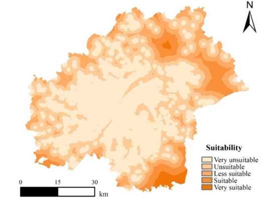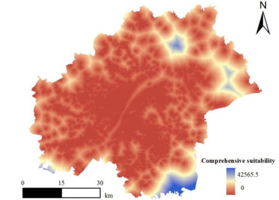 In general, the spatial distribution of the comprehensive suitability of all influential factors fits the actual situation of the geographical location of Wuhan. The comprehensive suitability of the northeastern hilly area and Hanjiang River is relatively low, whereas that of other areas is high.