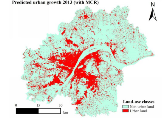 In conclusion, both models consider the influence of similar factors, such as distance from the freeway, railway, main road, collector streets, and river and slope. Results show that the MCR-modified CA–Markov model can better predict forest, water, and other ecological factors than the non-MCR model. The MCR model can be applied to develop approaches for protecting the local ecological environment because it can express resistance values in urban expansion, such as woodland and water bodies, that represent areas that are unsuitable for urban development and construction. Therefore, this method excludes ecological land, such as woodland and water, from future urban expansion. By contrast, the non-MCR model ignores ecological land and identifies all areas as equally suitable for future urban expansion.