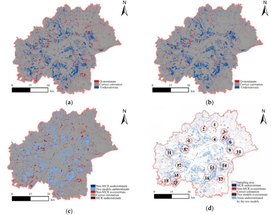 The MCR model is not more likely to overestimate red regions than the non-MCR model. These red regions are mainly located in sampling areas 1–5, 9–10, 14–15, and 17–19. Sampling areas 1–4 and 10 represent water bodies; 14, 15, 17, and 19 represent woodlands and 5, 9, and 18 represent intersections between water bodies and woodlands. These regions are estimated correctly because the MCR model accounts for the influence of ecological factors on urban expansion.