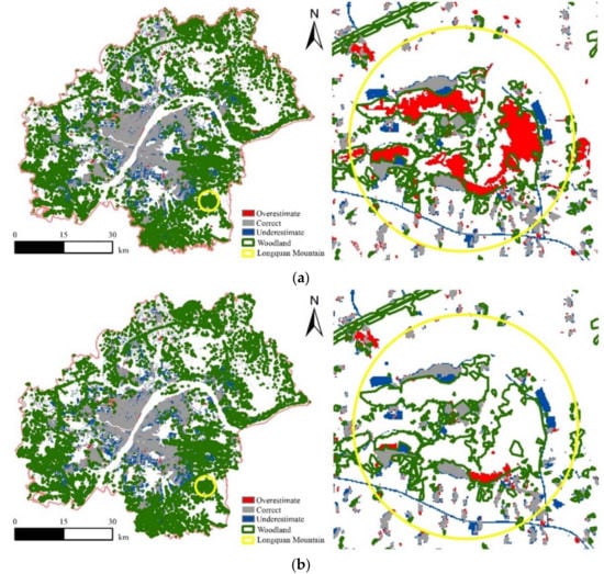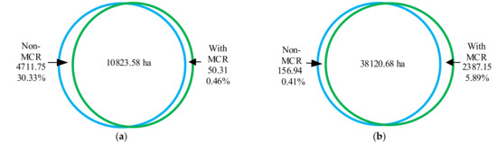 Given that the original land type of this area is woodland, the MCR model shows that it is unsuitable for urban expansion. The original natural ecological land forms the ecological matrix of the Wuhan metropolitan area and should be protected. However, the non-MCR model simulation results ignored the ecological condition of this area, thus leading to overestimation, as shown in Figure 10a.