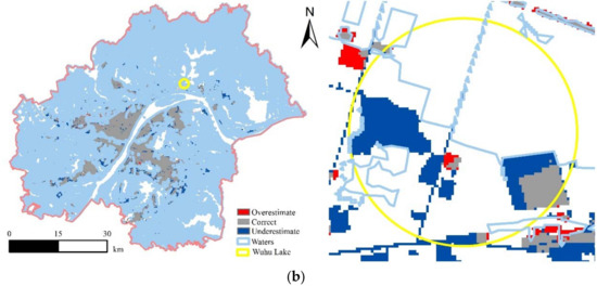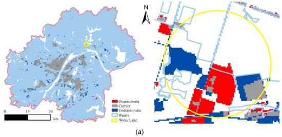 Analysis of the result of Wuhu Lake at the micro level. (a) Simulation of urban expansion in 2013 by the non-MCR model; and (b) simulation and overview of urban expansion in 2013.