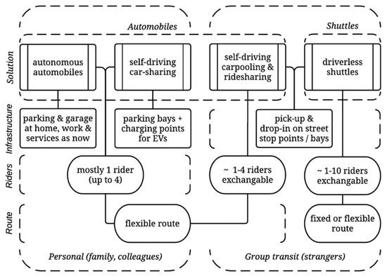 - due to the absence of a driver, the ridesharing/carpooling (Blablacar)/ride-hailing/sourcing (TNC (Transit Network Companies): e.g., Lyft, Uber, taxi) merges with car-sharing (yet, we can still share a ride in the shared car);