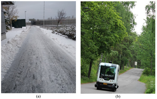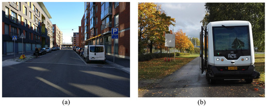 - Requirements for the operating area: For safety reasons, the speed limit should be 30–40 km/h, so the relative velocity would not grow dangerously high between the bus and other vehicles. If the route is shared with faster vehicles, they will need to be able to overtake the robot bus safely. The best situation would be a route free of on-street parking in the area, or if it could be completely banned. If there is on-street parking, the parking area should be clearly marked and the street needs to be wide enough (see Figure 13a). The robot bus has to be able to move freely along its route. All potential distractions e.g., wrongly parked vehicles disturb the operation of the robot bus, in which case the operator has to take control over the functioning of the bus. The lane must be at least four meters wide, because of the required safety distance. The bus may uncomfortably slow down, if the lane is narrower. The bus should not be programmed to run closer than 1.5 m from identified street-side parking areas or fixed objects like roadside vegetation. The bus recognizes these things as obstacles and slows down the pace and eventually stops if an object is too close (<0.3 m). The robot bus needs priority in intersections. Priority was carried out by stop signs and traffic lights in SOHJOA-project. Weather conditions such as in Figure 14a, featuring snow or heavy rain as well as the flying leaves from the trees can cause emergency stops for the robot bus as they are interpreted as an obstacle. These factors should be also noticed while planning the route.