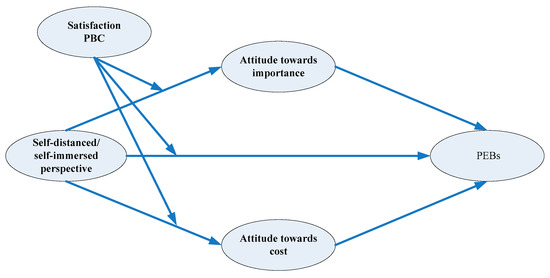 The self-distanced perspective facilitates pro-environmental behaviors via the function of autonomous self-regulation. Self-regulation can guide PEBs directly, because it denotes the monitoring of one’s own behavior and adapting that behavior so that it reflects one’s goal or expectation [35,36]. Self-regulation can also motivate PEBs indirectly via attitudinal factors. Individuals with more self-regulation also tend to display higher pro-environmental attitudes, and consequently positive attitudes lead to individuals’ positive responses to PEBs [37,38]. Combining these arguments, we argue that the self-distanced perspective influences PEBs not only directly, but also indirectly, via the role of attitudes towards importance and cost. Thus,