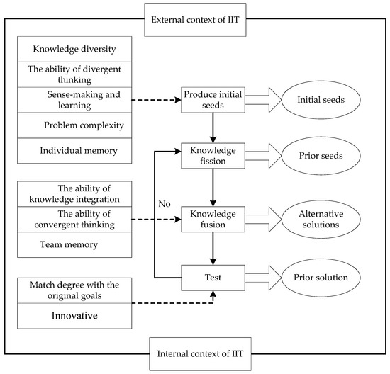 Divergent thinking is an important driver of knowledge fission. Compared with homogeneous groups or individuals, IITs have an advantage with divergent thinking because novel ideas can result when one group members’ idea stimulates a novel connection in another’s associative hierarchy [58,79]. Through divergent thinking, team members can come up with all the ideas related to the problem, which provide a guarantee for the solution to the problem.