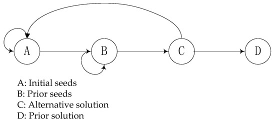 From the above analysis, we can regard the problem of knowledge interaction as a random process. Although the actions (knowledge fission and fusion) taken by team members have been determined as shown in Figure 1, interactive seeds can be in different states at different times. We do not know how the interactive seeds transfer among different states under knowledge fission and fusion. The probability distribution of the state of the current interaction seeds is only related to the state of the previous period, and has nothing to do with the earlier state. Also, the previous state is only related to the earlier state. Recursively, the current state is a step-by-step accumulation of all the previous states. The previous state is also the accumulation of all the earlier states. Hence, the current state is only related to the previous state. In this sense, the process of knowledge interaction is both a Markov process and the accumulation of knowledge. Therefore, we can use the Markov process to analyze the current states and predict future states of interactive seeds. The state transition process of knowledge interaction is shown in Figure 2. The state A, B, C, D represent interactive seeds in different states, initial seeds, prior seeds, alternative solution, and prior solution. The arrows represent transitions among the four states.