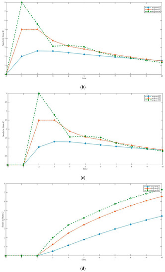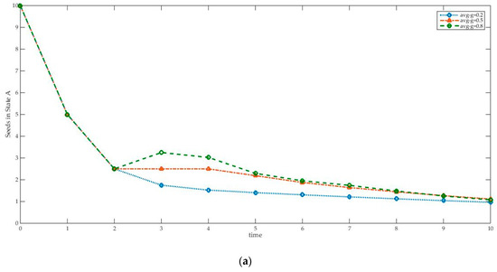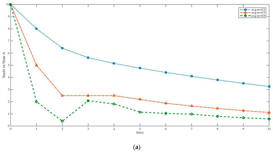 This section mainly explores the influence of knowledge fission on the knowledge interaction process. avg-m is the average value of knowledge fission. Figure 3a shows the change of interaction seeds in State A over time. We can see that the interaction seeds gradually decrease in the three cases, avg-m = 0.2, avg-m = 0.5 and avg-m = 0.8. And when avg-m = 0.2, the interaction seeds are more than avg-m = 0.5 and avg-m = 0.8. This shows that the bigger the knowledge fission value, the more favorable it is for the interactive seed transfer from State A to State B.