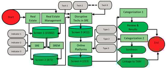 Figure 2 details the search mechanisms used in this study. The screens refer to the results obtained from the search engines mentioned above; new additions relate to either a keyword used in conjunction with a previously used keyword or a new search engine/database. Such screening has been used: to extract literature pertinent to clinical information [53], in social science literature reviews [54], and for PRISMA analysis that incorporates systematic reviews and meta-analysis to extract preference-based information [55]. The purpose of the screen here is to omit irrelevant information in accordance with the study objectives and to keep a tight focus on disruptive technologies in SRE. Four screens were used, in which Screen 1 limits the literature to real estate, Screen 2 in general limits the literature to SRE, Screen 3 adds the technology aspect to the literature and Screen 4 adds aspects of online dissemination.
