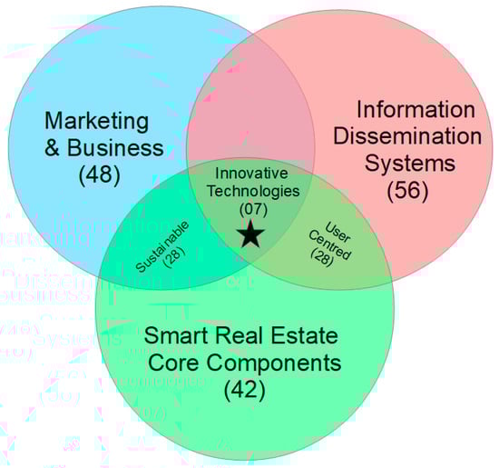 Figure 3 focuses on categorisation 1 for the current study, where three critical aspects of SRE—core real estate components, information dissemination systems, and marketing and business—are considered. Analysis yielded 48 publications for marketing and business, 56 for information dissemination systems, and 42 for core SRE components. Twenty-eight publications were identified as merging SRE core components and marketing and business within the domains of innovation and sustainability. Thirty-two publications were classified as merging SRE core components and information dissemination systems within the domain of user centredness. Only seven publications, comprising one journal paper, one conference paper and five online webpage articles, were identified as sitting within the domain of innovative technologies.