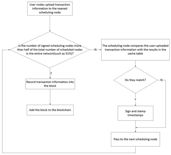 This paper proposes an improved PBFT (iPBFT) algorithm whose underlying principle is using the automatic transaction mechanism of the system to verify transaction information. It can be seen in Figure 1 that the transaction is verified by u 1 and u 2 after completion, after which both encrypt and upload the transaction data to the nearest scheduling node s i , which verifies the information based on its cache table, signs and timestamps it if the verification is successful, and then sends these data to other scheduling nodes. If the number of signed nodes is more than half of the total nodes (such as 51%), consensus is said to be reached, after which the transaction is recorded in the block and the block is appended to the blockchain (as show in Figure 2).