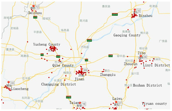 Our case study data were provided voluntarily by 300 small- and medium-sized agri-food enterprises in Shandong Province. The data include profits between January 2014 and December 2017. In total, 14,382 profit data items were collected. The data also cover the type of transaction products in terms of species (e.g., wheat, corn or soybean), the weight of transaction products, a description of the location (region, spatial coordinates and location type) and the timestamp of the transaction. The specific data format is shown in Table 1. The three sets of data here show the supply of wheat by Company A on 12 and 16 May 2017. To protect the privacy of the enterprise, the company name and other related data are processed and given a general description. The general geographical distribution of enterprises is shown in Figure 4. In this figure, the red dots show the distribution of enterprises and the numbers represent the number of enterprises involved in this study.