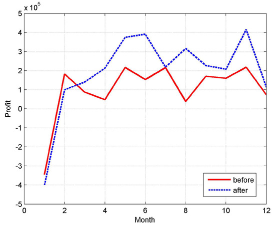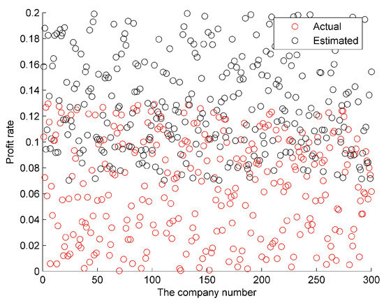 Next, the authors used the profit data of 300 food enterprises in 2016 for further research. After analysis of a series of variables influencing the profit rate, the variables that can affect profits of food enterprises were determined. Econometric software was used to calculate the correlation coefficient of each variable, and the regression model before and after using FTSCON was established. In the regression equation, one-year’s profit rate is taken as the dependent variable of the equation. Through linear regression, the estimated profit rate (lower limit of profit) and revised profit rate (upper limit of profit) after using the system were obtained. The consent of 15 companies was obtained, and their relevant data are shown in Table 2.