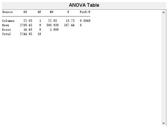 It can be seen in Figure 7 that, in the case of the significance level α = 0.05, the null hypothesis is that there is no significant difference between the two datasets. Since p(Prob>F) = 0.0049 < 0.05, the null hypothesis is rejected. There is a significant difference between the two datasets. In addition, it can be seen that the differences between the columns are significant, indicating that FTSCON has a significant effect. The differences between the rows are extremely significant, indicating that the difference in profit increase is extremely significant for these companies.