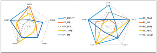 Analysing the results obtained in these projects, in general terms, the highest values were identified in Case 4, followed by Case 5 and Case 1. When the nature of these results is analysed, the ranking is altered for the environmental outcomes. Thus, Case 4 as in first position, then Case 2 and followed by Case 5, as seen in Figure 1.