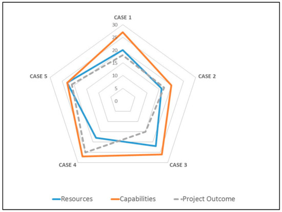 If the level of available resources and capabilities of the firms was compared with the projects’ outcomes in each case study, it can be observed that these levels were coherent with the projects’ outcomes in three of the five cases and, in general terms, the level of the firms’ capabilities was higher than the obtained results (Figure 2).