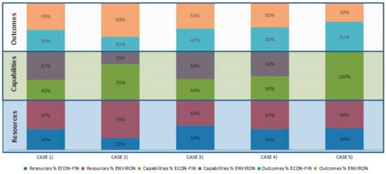 In terms of economic and structural capabilities (FC), Cases 4 and 5 were at the top level, followed by Case 1 and 2, although nearly all cases exhibited a similar level of capabilities. The order was slightly different in environmental capabilities (EC), as Cases 1, 3 and 4 exhibited a higher level, with a greater difference being noted with regard to Cases 5 and 2, as can be observed in Table 7.