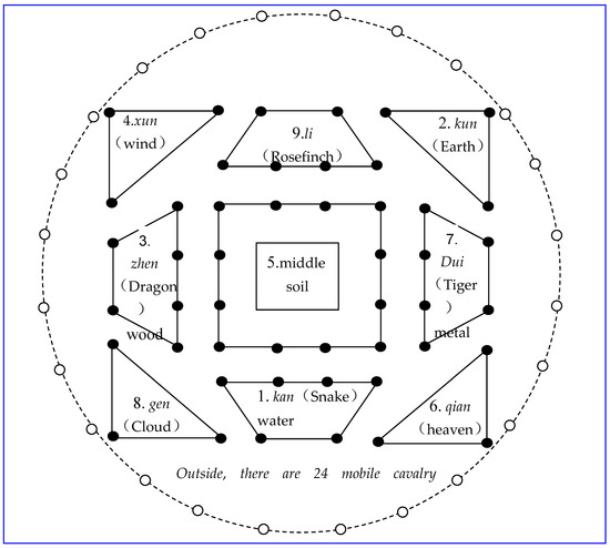 Just as Luo Guanzhong wrote in Chapter 84 of Romance of the Three Kingdoms [30] that, Zhuge Liang arranged the eight-trigram battle formation, consisting of leisure, life, injury, du (hiding), jing (good luck), death, panic, opportunity, in the sixty-four formations as a whole, which, plus another twenty-four mobile troops of cavalry, scared away hundreds of thousands of elite soldiers from the Kingdom of Eastern Wu. Zhuge Liang held that the military “formation (陣)” and “Shi (勢) position)” depended not only on weather condition (天時), but on human deliberation (人謀). Taking in the arrangement of “the Square-Field” and “the Eight Trigrams”, “the Diagram of the Eight-Sided Battle Formation” (The arrangement of the eight battle formations is actually “the Diagram of the Wenwang Eight Trigrams” or “the Azimuth Diagram of the Eight Trigrams”). Each formation is composed of six smaller formations, referring to the six lines in the eight trigrams (where the solid line represents positive and the broken line represents negative) of Book of Change (the version of the Zhou dynasty). There are sixty-four smaller battle formations (eight battle formations plus middle troops), corresponding to the sixty-four hexagrams in Book of Changes (the version of the Zhou dynasty) constructed the spatial relationship among Heaven, Earth, and Human [31]. The Figure 3 below shows a remake of Diagram of the Eight-Sided Battle Formation based on the verbal descriptions in the Romance of Three Kingdoms. Table 2 presents and interprets the whole arrangements based on “Eight Diagrams and Nine Palaces”. The arrangement of the Eight-Sided Battle Formation and “the Diagram of the Wenwang Eight Trigrams (文王八卦方位)” are positioned according to “the Eight Trigrams” and shaped in line with “the Square-Field (井地)”, which are displayed in Figure 3 and Table 2: The formation of Heaven—the qian (乾) trigram (the symbol of heaven) in the northwest; the formation of Turtle and Snake—the kan (坎) trigram (the symbol of water) in the back, belonging to water (水) within the five elements (五行); the formation of Cloud—the gen (艮) trigram (the symbol of mountain) in the northeast, with clouds coming out of the mountain; the formation of Green Dragon—the zhen (震) trigram (the symbol of thunder) on the left, belonging to wood (木) within the five elements; the formation of White Tiger—the dui (兌) trigram (the symbol of pond) on the right, belonging to metal (金) within the five elements; the formation of Earth—the kun (坤) trigram (the symbol of earth) in the southwest; the formation of Rosefinch—the li (离) trigram (the symbol of fire) in the front, belonging to fire (火) within the five elements; the formation of Wind—the xun (巽) trigram (the symbol of wind) in the southeast; the main formation and the nucleus of the Eight-Sided Battle Formation —middle troops (中軍) with a commander in the center, belonging to soil (土) within the five elements and governing the Eight-Sided Battle Formation, surrounded by the formation of 24 mobile troops of cavalry. Together with the 24 mobile troops of cavalry, the Eight-Sided Battle Formation has formed a complementary spatial system which combines motion and stillness, integrates order and change.