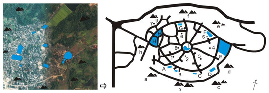 Because of the Chinese tradition of maintaining the cultural ties and worshiping ancestors, the village was originally called “Gaolong Village”, which implied the experience of their ancestor—the ancient strategist Zhuge Liang once “staying in Longzhong”. It was a metaphor for “the talented person from Longzhong”. Later on, with the development of the Zhuge family, the name of the village has been changed into Zhuge Village [21]. The cultural landscape model of Zhuge Village integrates Zhuge Liang’s art of war—“the Diagram of the Eight-Sided Battle Formation” with the Chinese traditional Feng shui. The Caution Hall of Zhuge Village collected the Genealogy of the Zhuge Family (1947) [27]. It was recorded that “the Eight-Sided Battle Formation was so useful and applicable in the warfare that the essence of it has been written in the ‘the Diagram of the Eight-Sided Battle Formation’”. “Doing research on Feng shui, the twentieth-generation from Zhuge Liang looked for a fortunate settlement. Finally they settled down in Gaolong”. The association between Zhuge Village and the Diagram of the Eight-Sided Battle Formation can also be traced. According to Genealogy of the Zhuge Family (1947), on 31 March 1134, Emperor Gaozong wrote a letter to Zhuge Hui, descendant of Zhuge Liang, “I heard there is an original copy of the Eight-Sided Battle Formation by Zhuge Liang. Can you bring it for me to take a look?”