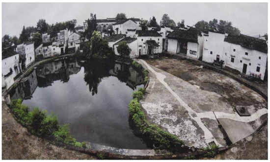 Located on the bottom land of the basin in the valley, Zhuge Village digs ponds and wells to meet the needs of irrigation, drainage, washing, and fire control in balance. Positioned in the center, the Taiji-shaped pond—Zhong Pond (Figure 5) extends in eight directions like “the Eight Trigrams” into eight lanes, and together with such the pond system spreading all through the village in the lower ground. Totally eight ponds, namely, Shangfang Pond, Jiqing Pond, Xiwu Pond, Beilou Pond, Julu Pond, Hongyi Pond, Shang Pond, and Xia Pond, are situated in eight different locations like the eight trigrams. These ponds are not only useful to prevent flood and drought, but also beautiful landscapes of the village.