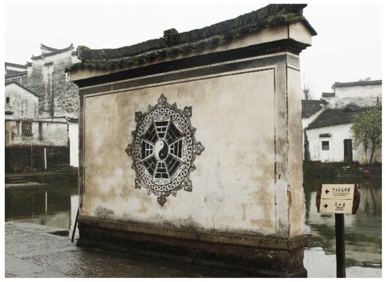 The whole space is as The Commentaries in the Book of Changes: The Appended Remarks states, “in the system of I there is the Grand Terminus, which produced the two elementary forms. Those two Forms produced the four emblematic symbols, which again produced the eight trigrams”. In other words, the way of heaven and earth, from the Non-Ultimate to the Great Ultimate, is producing everything by yin and yang, localizing space from east, south, west and north, symbolizing the myriad things in the universe, which reflects the interrelationship between man and nature, explains the growing process of everything, and constitutes a special cultural landscape model. Through field research, we found that there was “the Azimuth Diagram of the Eight Trigrams” painted on the screen wall (shown in Figure 6) beside Zhong Pond in the center of the village, and when we compared it with the real spatial layout, I also found that it proved that Zhuge Village, in accordance with “the Eight Trigrams” and in combination with mountains, rivers and the architectural spatial layout, created the landscape structure of inner and outer eight trigrams.