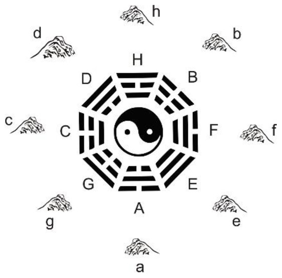 Traditional Chinese living communities focus on the unity of families with the emphasis of interdependence and completeness. In terms of space, there is a clear distinction between inside and outside. Inside is the living space for human beings. Outside is for activities [32]. The constructions of Zhuge village strictly followed the Eight-Sided Battle Formation, showing the wisdom of the art of war by Zhege Liang. In the center of the village is Zhong Pond, with eight lanes pointing to eight different directions forming the inner eight trigrams. Outside and surrounding the village are eight hills, naturally forming the outer eight trigrams. The inner and outer trigrams have made Zhuge village an ideal living place for human beings, as shown in Figure 7. Inside buildings are: Huide Hall in Northwest representing Qian (E), Shangli Hall in Southwest representing Kun (B), Zhaoji Hall in the east representing Zhen (C), Prime Minister Shrine in the southeast representing Xun (D), Dagong Hall in the north representing Kan (A), Dunhou Hall in the south representing Li (H), Shangzhi Hall in the northeast representing Gen (G), and Chongxin Hall in the west respresenting Dui (F). Outside are the eight hills representing eight battle formations with Shixia Hill in the northwest symbolizing Heaven (e), Zuzhai Hill in the southwest symbolizing Earth (b), Leigu Hill in the southeast symbolizing Wind (d), Guotai Hill in the northeast for Cloud (g), Taigong Hill in the east for Dragon (c), Mouse Hill in the west for Tiger (f), Jingtanghou Hill in the south for Bird (h), and Dayuan Hill in the north for Snake (a). The earlier settlers in the Zhuge village ideally combined nature and human wisdom. The eight sights in Zhuge village are like eight moving battle positions in the Eight-Sided battle formations. The whole environment in Zhuge village reflects the life philosophy of Zhuge Liang: One cannot show high ideals without simple living. One cannot have lofty aspirations without a peaceful state of mind.