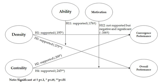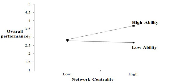 To better understand the interaction effect, we drew the interaction graph in Figure 2 following the recommendation of Aiken and West [52]. Figure 2 presents that a firm occupying central position can experience higher overall performance when its employee ability is high. However, if it is low, overall performance is not enhanced, even though the firm is occupying the central position. Thus, employee ability plays the moderating role in affecting the relationship between the network centrality and overall performance. Figure 3 shows the supported hypothesis results and H12 result.