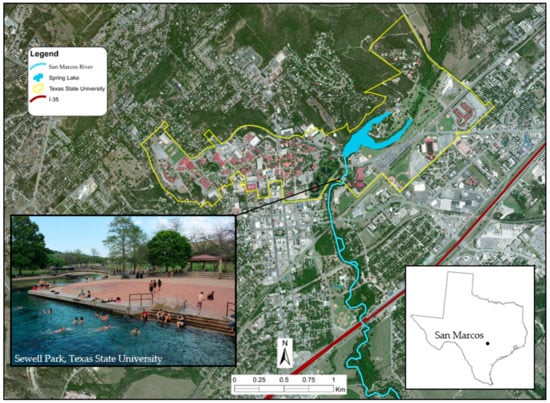 The blue space examined here is the San Marcos River (SMR) (Figure 1), which drains 130 km2 of the Texas Hill Country that is mostly grasslands and oak/juniper woodlands. The baseflow of the river (a median discharge of 5 m3/s) is derived from groundwater that has filtered through the karst Edwards Aquifer system and emerges at the San Marcos Springs within the impounded Spring Lake. The water exiting the springs is well above drinking water quality standards for cleanliness/clarity and has never run dry in recorded human history [35]. Largely due to the continuous flow of high-quality groundwater, the river system is home to seven unique species that are either endangered or threatened, with several being endemic to the river system [36]. After the water leaves Spring Lake, it becomes the SMR and its shorelines are publicly accessible parklands owned by Texas State University and further downstream by the City of San Marcos (Figure 1). These river parks receive approximately 300,000 visitors every year, including residents, students, and tourists from around the world. With the river being so integrated into the built environment, a strong sense of place is present and the numerous interactions provide many opportunities to study cultural ES [35].