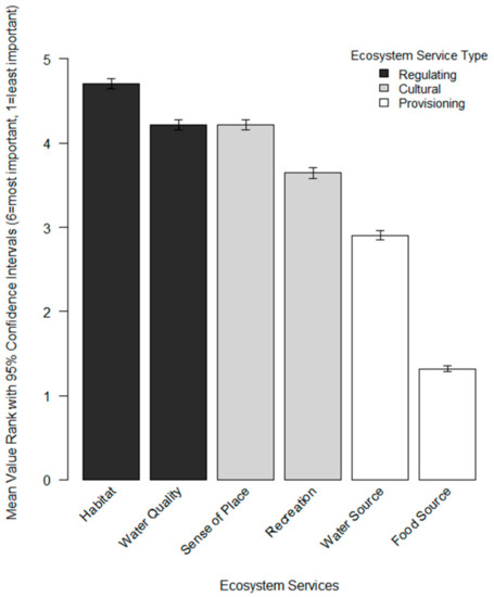 While students had a similar general awareness of ES, their preferences for particular services varied widely (Table 6; Figure 2). Regulating service benefits was consistently ranked higher than cultural and provisioning benefits, meaning that the students (collectively) placed higher values on the aquatic habitat and water quality of the SMR. This finding accords with previous studies on social demand of ES [40,47,48]; however, our finding of cultural services ranking higher than provisioning services does not match many of these previous studies. This anomaly can be explained by the fact that university students tend to have greater demand for outdoor recreation, education, the arts, and cultural activities [49]. Our study supports previous work highlighting the importance of cultural ES to university students but also suggests that university students are aware of the ES benefit delivery mechanisms of the river. Using the three general categories of value from previous literature (the most recent one is the work done by Gómez-Baggethun et al. [50]), these collective results suggest that students see ecological values as most important, followed by sociocultural values, and lastly economic values.