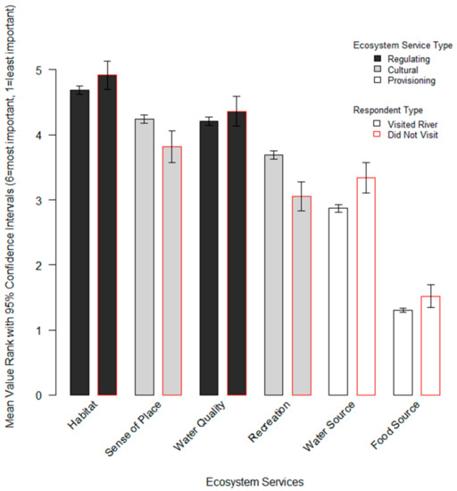 Students, who visited the SMR or its neighboring parks during the past year, had significantly more positive or favorable responses to our questions regarding the SMR’s benefits, management, and cleanliness (Table 7; test statistics are available in Table A3). Students who visited the SMR put a higher value on recreation and ES related to sense-of-place relative to non-visitors (Figure 3; Table A4). Non-visitors valued provisioning ES (water and food source) and habitat at significantly higher levels relative to visitors. Visitors and non-visitors also diverged significantly on their cultural ES rankings (Table A5). Figure 4 displays the students’ mean ranks of the six cultural ES that were included in our questionnaire; the median ranks followed an identical pattern. Those students, who visited the river or its nearby parks in the past year, tended to rank recreation highest (significantly more than non-visitors); whereas almost all non-visitors ranked the river’s aesthetic qualities as its most important service. Non-visitors also placed a significantly higher value on the river’s educational services (median = 4, mean = 4.19) relative to visitors (median = 4, mean = 3.75). Visiting the river was linked to stronger agreement that the SMR is sensitive to rapid urban growth (Table 7; test statistics are available in Table A3), with visitors mostly ‘strongly agreeing’ that the SMR is sensitive to growth (median = 5, mean = 4.43) with non-visitors primarily only ‘agreeing’ with this statement (median = 4, mean = 2.89). All the differences of these questions described here between visitors and non-visitors were statistically significant at a 99% level of confidence or better (Table A3 and Table A4).