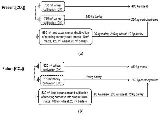 Consequential life cycle assessment (cLCA, e.g., references [11,12]) modeling was used to assess the environmental burdens of producing one extra tonne (the functional unit) of pig feed produced today (present CO2 scenario) and in a future with 550 µmole CO2 mole−1 (future CO2 scenario).