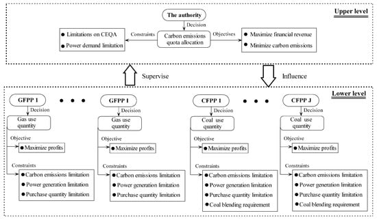 There are several decision makers involved in carbon emissions: the authority and CPPs. In the decision making system, the authority has the ability to make decisions first due to its higher position. Considering its own objectives, the authority makes an initial decision on CEQA and allocates carbon emissions to every CPP. Under the limited carbon emissions quota, CFPPs and GFPPs make their decisions on fuel use quantity and then give feedback to the authority. After the authority receives feedback from various CPPs, it has to reconsider the initial CEQA, makes an updated decision on CEQA and forwards the new scheme to the CPPs. The CFPPs and GFPPs again decide on fuel use quantity based on the new carbon emissions quota and feed back to the authority. From this interactive process, the authority finally decides on an optimal strategy under a termination condition, and the CPPs develop their own optimal coping strategy. As a result, the authority and CPPs finally reach an equilibrium that indicates the global satisfactory solution for the CEQA problem. During the process, the conflicts and cooperation coexist between the authority and CPPs. Therefore, a Stackelberg game is shaped; the authority plays the part of a leader while the CPPs act as the followers []. Bi-level programming, a hierarchal decision making structure, has the ability to describe Stackelberg game of different decision makers [,,].