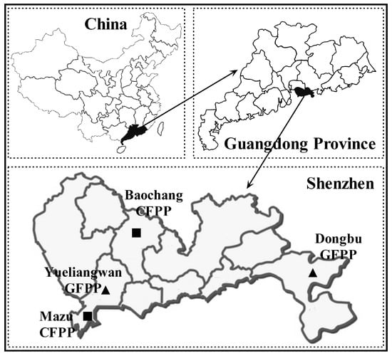 Shenzhen, the first special economic zone in China, is located on the China’s southeastern coast, adjoining Hong Kong. It covers an area of 1953 km and has a population of 10.63 million, with an 18.7 ten thousand CNY per capita in 2017 ranking the third all over China []. As one of the most developed region in China, Shenzhen has been actively developing CFPPs and GFPPs in order to deal with its electricity supply shortage. However, this results in the large amount of carbon emissions in Shenzhen. Therefore, it is necessary for Shenzhen to reduce carbon emissions while satisfying power demand required by economic development. To reduce the computational burden, only 2 CFPPs and 2 GFPPs in Jiangsu Province are chosen to use in the case study as shown in Figure 2: Mazu CFPP, Baochang CFPP, Yueliangwan GFPP and Dongbu GFPP. In CFPPs, three kinds of coal are burned for power generation: Shenhua coal, Datong coal and Indonesia coal.