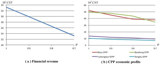 From Figure 4 we can see that when the authority has a stricter attitude towards carbon emissions reduction, the authority’s financial revenue and the CPPs’ economic profits both reduce. Take a example, when is set at 1, the authority’s financial revenue is 33.22, and the economic profits that Xuzhou CFPP, Yancheng CFPP, Nanjing GFPP and Yixing GFPP earn are respectively 52.15, 49.61, 13.88 and 10.46. When reduces to 0.9, the financial revenue reduces to 29.87, and the economic profits of the four CPPs are 45.13, 47.69, 11.99 and 9.02. Similar situation can be seen in other situations. Furthermore, carbon emissions reductions targets more significantly affect CFPPs than GFPPs.