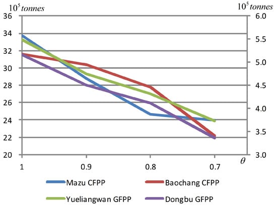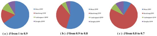 From Figure 5, all the carbon emissions quota reductions that different kinds of CPPs receive reduce when the authority’s attitude towards carbon emissions reduction is stricter. However, their decreased amounts are different. For example, when changes from 1 to 0.9, carbon emissions quotas that Mazu CFPP and Baochang CFPP respectively receive reduce by 4.93, 1.26, while Yueliangwan GFPP and Dongbu GFPP reduce by 0.75 and 0.65. Similar situation can be seen in other situations in Figure 6. Therefore, when the authority sets carbon emissions reduction targets, less change would happen in GFPPs carbon emissions quota compared with CFPPs, as burning gas produces less carbon emissions than coal.