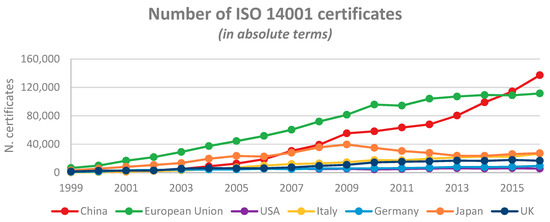 Number of ISO 14001 certificates in the period 1999–2016 for China and other countries and political unions. Data source: [51].