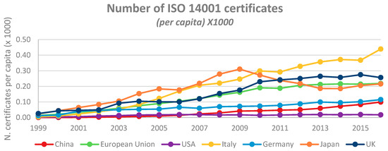 In order to evaluate the certification level of China, the information provided by the ISO survey [51] has been used. Two comparisons are presented, first the number of certificates in absolute terms and then the number of certificates per capita (×1000). Figure 1 shows the number of ISO 14001 certificates in absolute terms in China compared with other representative countries and political unions. It can be observed that China has recently become the first country in absolute numbers of certifications, overcoming the European Union (EU) in 2015. This can be explained by the fact that the growth in Europe and China has been different in recent years. In Europe it has slowed down, probably due to the financial situation that effected the European Economic Area at the end of 2009, while in China the number has kept increasing exponentially. Other countries, such as the US and Germany, show a stable number of certificates, while in Japan the number has suffered a decline from 2009 to today.
