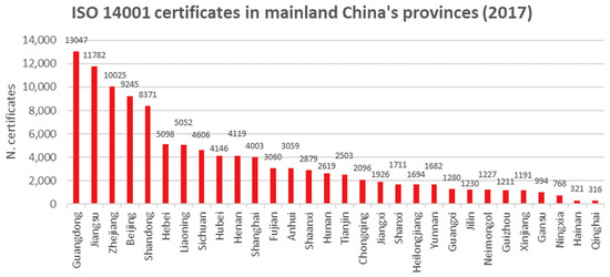 However, the distribution of ISO 14001 certifications in China has significant heterogeneity at the provincial level. As shown in Figure 3, more than 50% of the total number of certifications in China is concentrated in the eastern provinces of Guangdong (Pearl River Delta Region), the Yangtze River Delta Region (Jiangsu, Zhejiang and Shanghai), Beijing, Shandong, and Hebei [73]. By contrast, the western provinces of Xinjiang, Gansu, Ningxia, and Qinghai see the lowest implementation of the ISO 14001 standard. This reflects the manufacturing distribution of Chinese industries, which is mainly concentrated in the eastern coastal area of China [74].