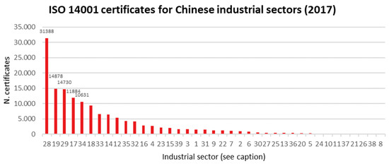 Figure 4 shows the distribution of ISO certificates among the 39 Chinese industrial sectors for the year 2017 [73]. The first six sectors account for 64% of the total number of certificates. The sectors with the major number of certification are the construction sector (28) which accounts for 22% of certificates, followed by the production of electronic, electrical and optoelectronic equipment (19) with the 10%, wholesale and retail of personal and household goods (29) with the 10%, production of basic metal and metal products (17) with the 8%, technology services (34) with the 7%, and machinery equipment (18) with 6.5%.