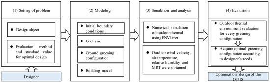 Currently, in the field of urban microclimate research, the application of numerical simulation methods has become increasingly widespread [2,11,12,23]. In this study, we used numerical simulation methods to optimize the design of the OTUS to improve the quality of the outdoor thermal environment. According to the above theoretical analysis, we summarized a framework of the optimization design of the OTUS for the outdoor thermal environment based on the designer’s different requirements, as shown in Figure 2. The framework is composed of four parts.