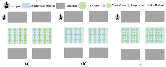 For landscape design above underground buildings, designers usually choose a method that combines trees, shrubs, and grasses to build a rich plant community, therefore creating a beautiful landscape with positive ecological effects. In this study, the ground greening configurations formed by middle- and high-level plant collocations and middle- and low-level plant collocations were mainly considered, as shown in Figure 3. According to engineering experience, designers usually choose shallow-rooted small trees, and the best planting locations correspond to the structural columns of the underground building.