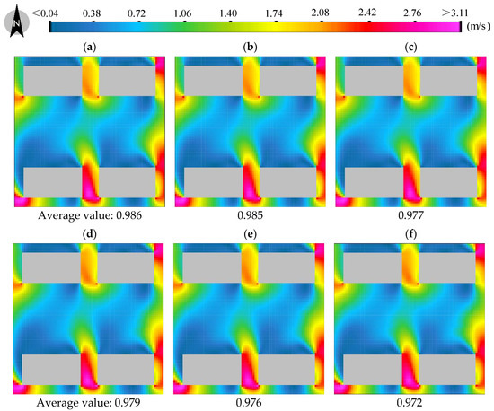 Time-averaged value of the average wind velocity for each configuration. (a–c) were middle- and low-level plant collocations corresponding to tree to shrub ratios of 2:3, 1:2, and 1:3; (d–f) were middle- and high-level plant collocations corresponding to tree to shrub ratios of 2:3, 1:2, and 1:3 (picture source: Author self-drawing).